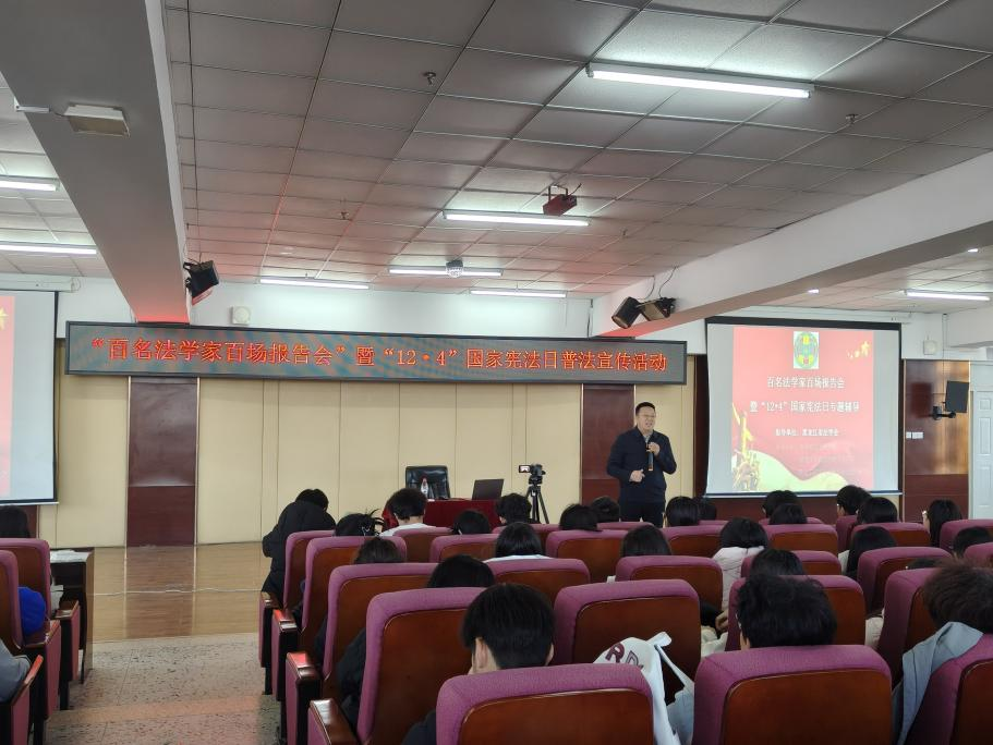 在第12个国家宪法日宣传周之际,为深入学习贯彻习近平法治思想,切实提升大学生法治意识与风险防范能力,助力青年学子成长为合格的社会主义接班人,12月5日,一场主题鲜明、内容丰富的“法育青春 宪启未来”普法讲座在图书馆501教室成功举办。本次活动由省法学会指导,黑龙江省政法管理干部学院、齐齐哈尔工程学院与省法学会刑事诉讼法学研究会联合主办,齐齐哈尔工程学院200余名师生现场参与学习,共同感受法治魅力。