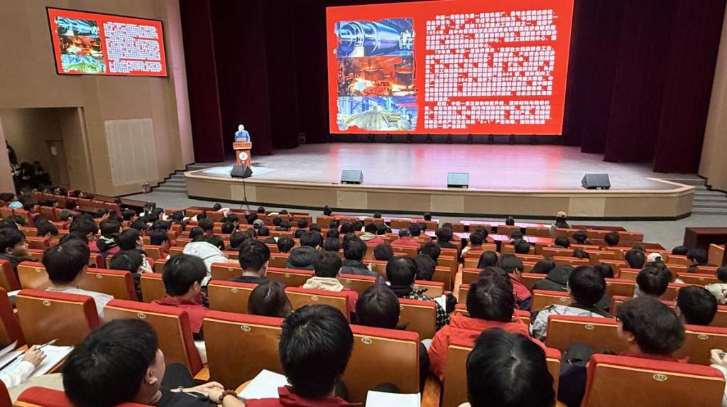 为深化“思专融合”协同育人实效、引导青年学子深刻理解、自觉践行工匠精神,11月21日下午,马克思主义学院在人民会堂举办“扬亮剑精神·铸工匠之魂”第五期工匠学苑系列活动。本次活动特邀全国人大代表、全国劳动模范、大国工匠年度人物、中国一重集团水压机锻造厂副厂长刘伯鸣担任主讲,以“以匠心·守初心”为主题,为师生们带来一场启迪智慧、感悟匠心的精彩讲座。马克思主义学院全体教师及2024级机电学院学生共同聆听了讲座。